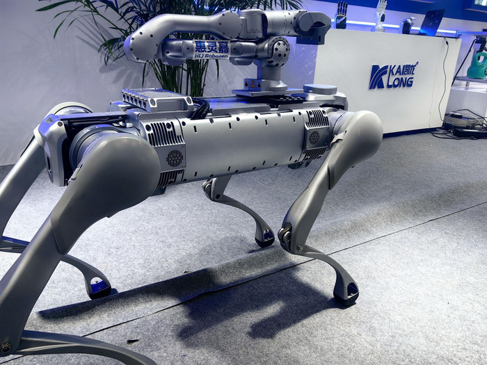 在博览会上,凯奇具身智能推出的“惠灵嘉”系列人形机器人和多足机器人颇受与会者关注,时不时都会有人前来合影拍照。